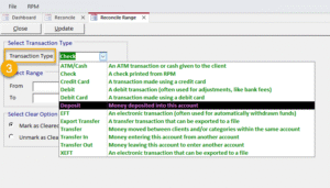 And last but not least: new wording on the Reconcile Range screen, which will now reference “Transaction Type” (instead of Payment Method) to make it clear that you can also clear/unclear ranges of deposit and transfer transactions.