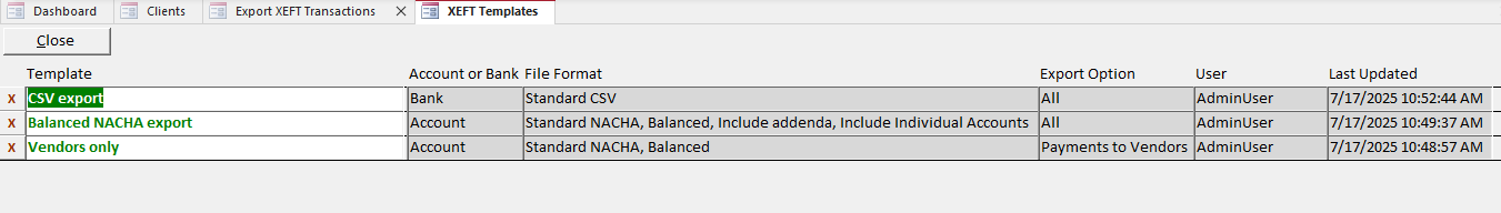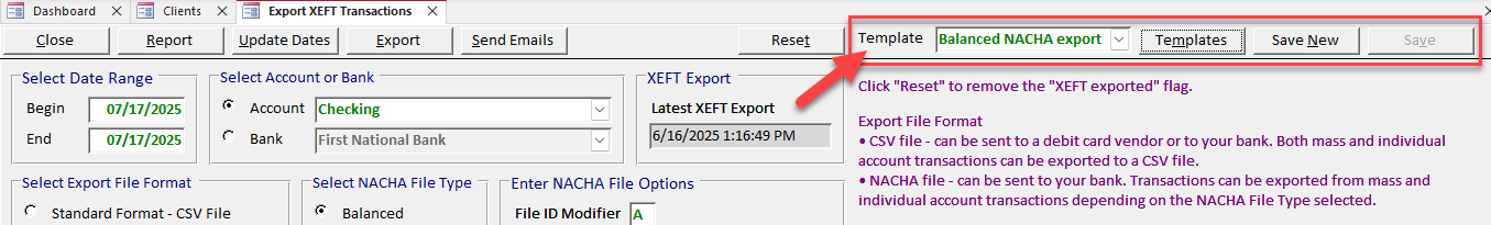Do you struggle to remember which settings to choose for different XEFT export files? Struggle no more! Now, you’ll be able to set up your templates one time, then choose those settings from the “Template” dropdown list indefinitely. Choosing a template will automatically update the screen based on that template’s saved settings, including the export file location and all format options. Just choose your template and export your file!