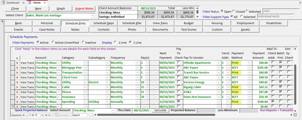 Here, you can see several scheduled transactions that are set to “Print.” When these transactions are processed every week/month, checks will be ready to print.