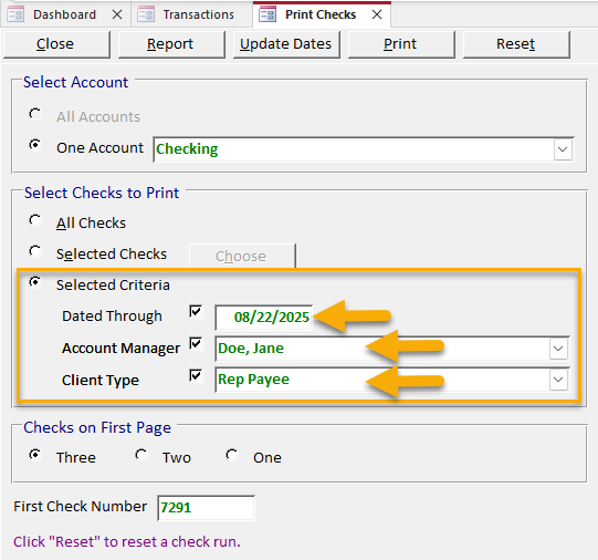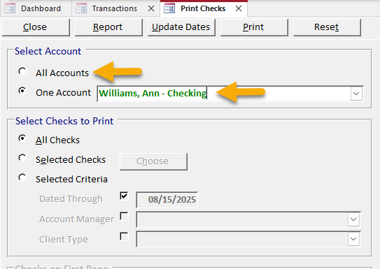To filter checks by date, account manager, or client type, select the “Selected Criteria” option. Then, type or select a “Dated Through” date, account manager, and/or client type.