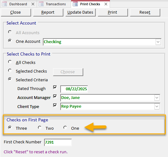 If you’re printing three checks per page, select how many checks will print on the first page of this check run by clicking one of the radio buttons in the “Checks on First Page” section. Your check layout settings can be changed in Utilities > Setup > Check Layout.