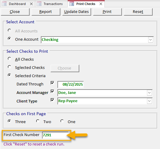 If you’ve printed your checks and realized something went wrong—for example, your check paper jammed, your printer ran out of ink, or you forgot to replace the drum and there are unsightly black streaks all over the checks—you can immediately reset them and try again.