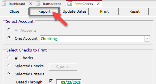 After you’ve selected your checks, review them by clicking Report. This will open up a Checks Selected to Print report on which you can see details about the transactions that will be printed.