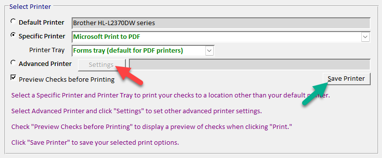 To save your printer, tray, and preview settings for next time you print checks, click Save Printer. If this was a one-time change, don’t save, and your previous defaults will return for next time.