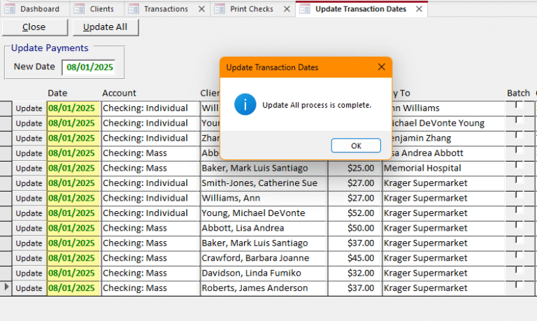 At the top of the Print Checks screen, click the Update Dates button to open the Update Transaction Dates screen. Here, you can update the dates of checks waiting to be printed, either one at a time or all at once.